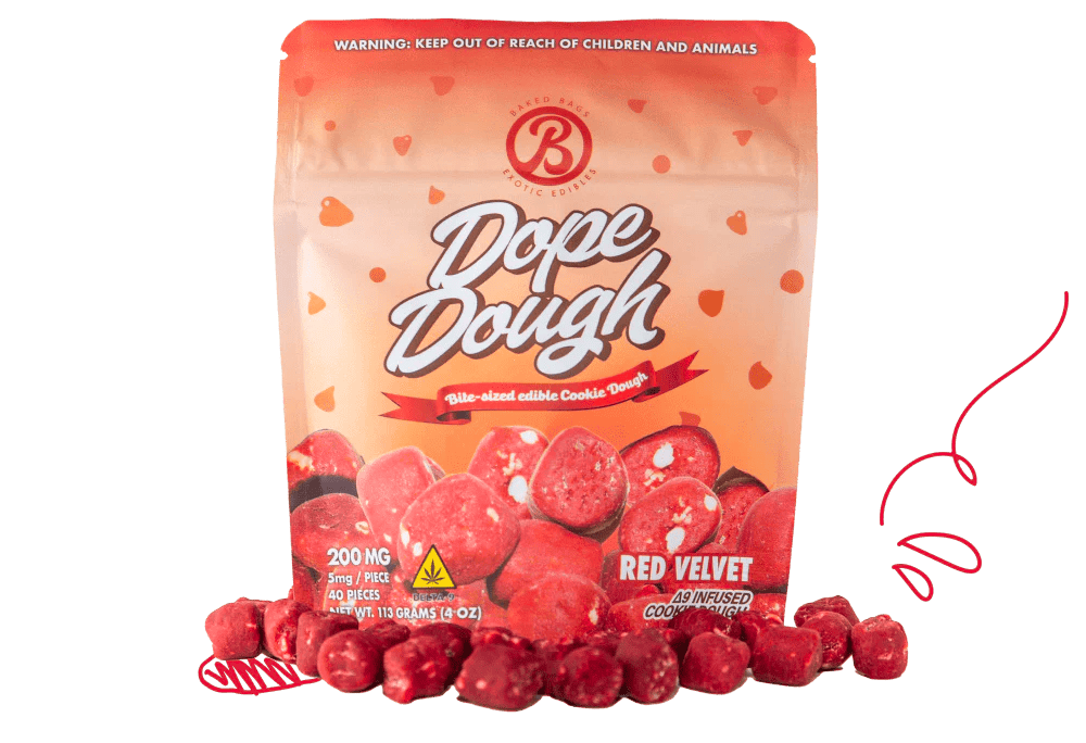 Experience the luxurious flavor of Baked Bags Red Velvet Dope Dough, the perfect balance of Delta 9 THC and rich dessert goodness.