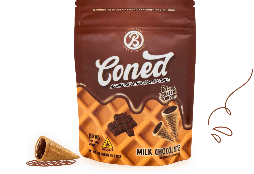 Satisfy your cravings with Milk Chocolate THC Ice Cream Cones by Baked Bags. Each cone delivers 25mg Delta-9 THC for a delicious and euphoric experience.